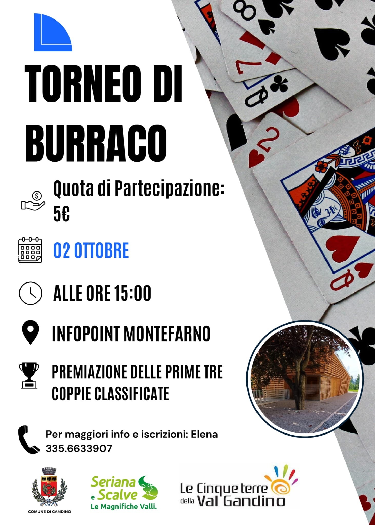 Mercoledì 9 ottobre presso l'Info Point Monte Farno è in programma un torneo di burraco. Mettete alla prova le vostre abilità e sfidate altri giocatori in un'atmosfera divertente e competitiva.