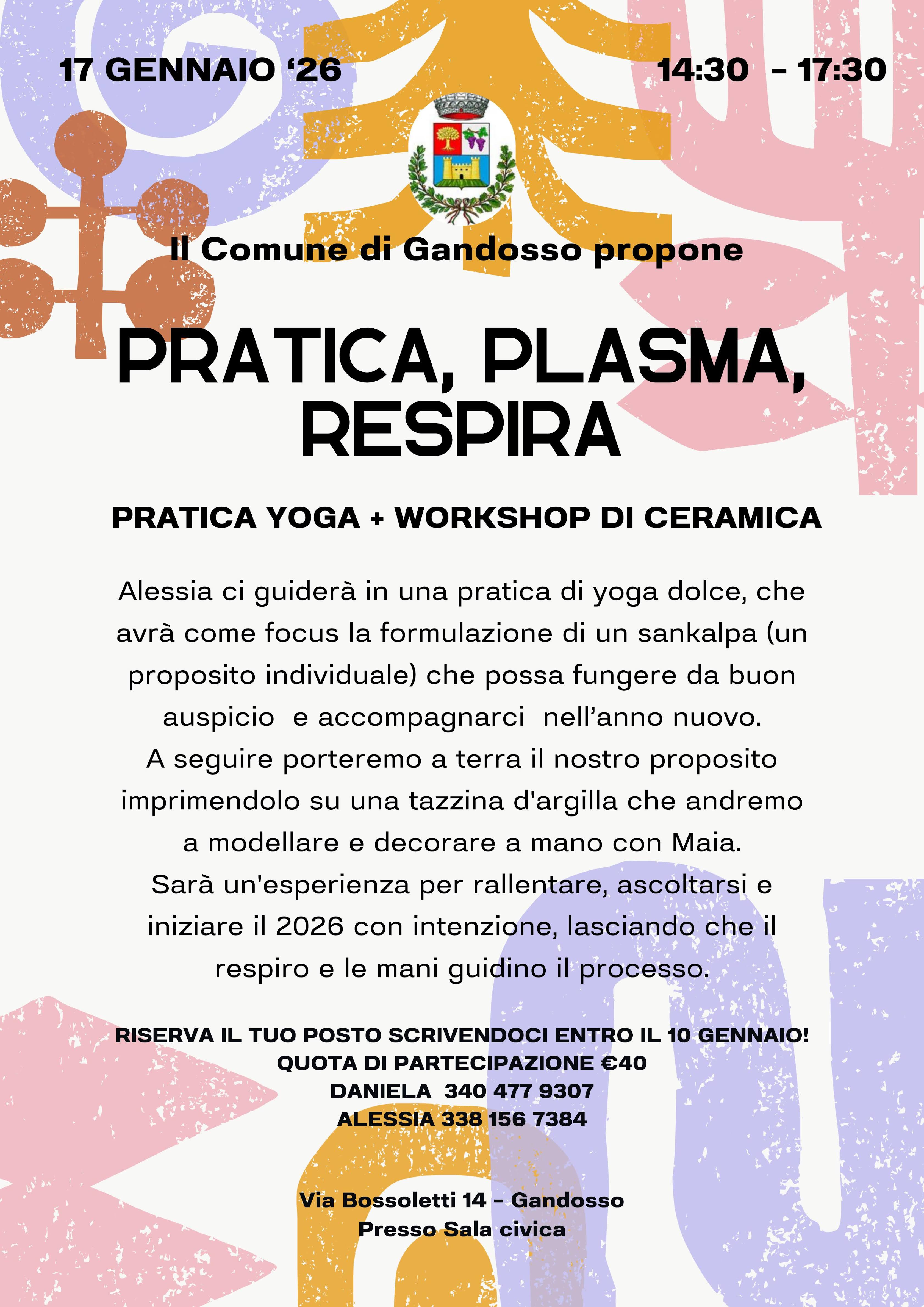 Il Comune di Gandosso propone un pomeriggio dedicato al benessere, alla creatività e all’ascolto di sé, per iniziare il 2026 con presenza e intenzione. In programma un’esperienza che unisce yoga dolce e lavoro manuale con l’argilla.