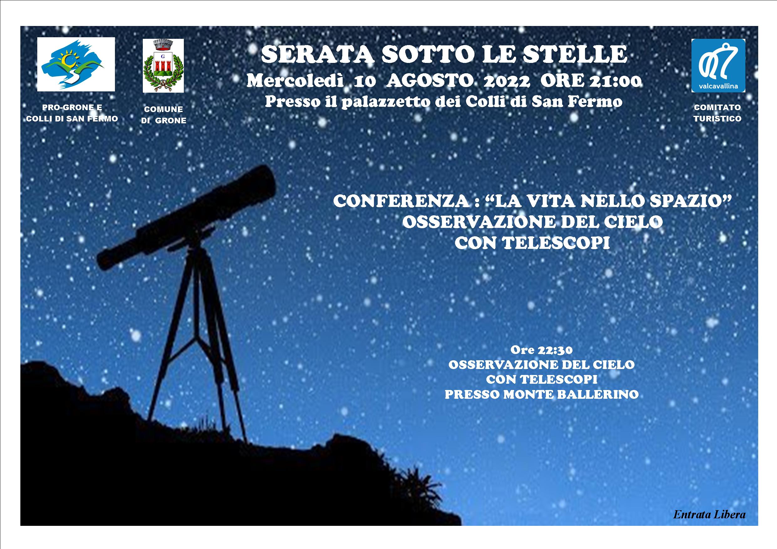 La sera del 10 agosto alle ore 21.00, è organizzata una conferenza "La vita nello spazio" al palazzetto dello sport dei colli di San Fermo, seguita alle ore 22.30 dall'osservazione del cielo con telescopi presso il monte Ballerino. Non perdetevi questa occasione stellare!