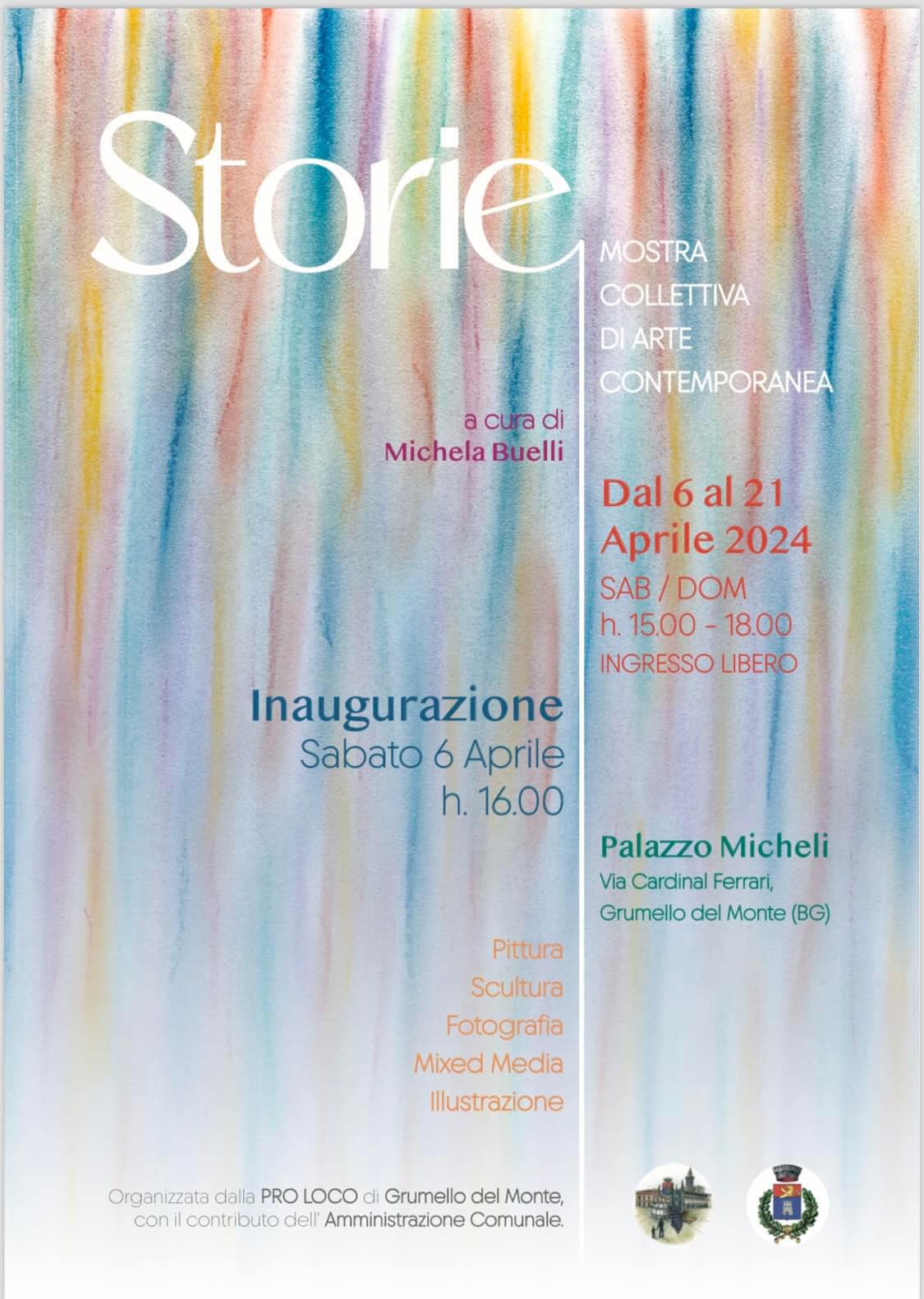 Da sabato 6 aprile a domenica 21 aprile, solo nel weekend si terrà la mostra collettiva di arte contemporanea "Storie" di Michela Buelli, presso il Palazzo Micheli di Grumello del Monte. Orai apertura mostra: Sabato e domenica: 15:00 - 18:00