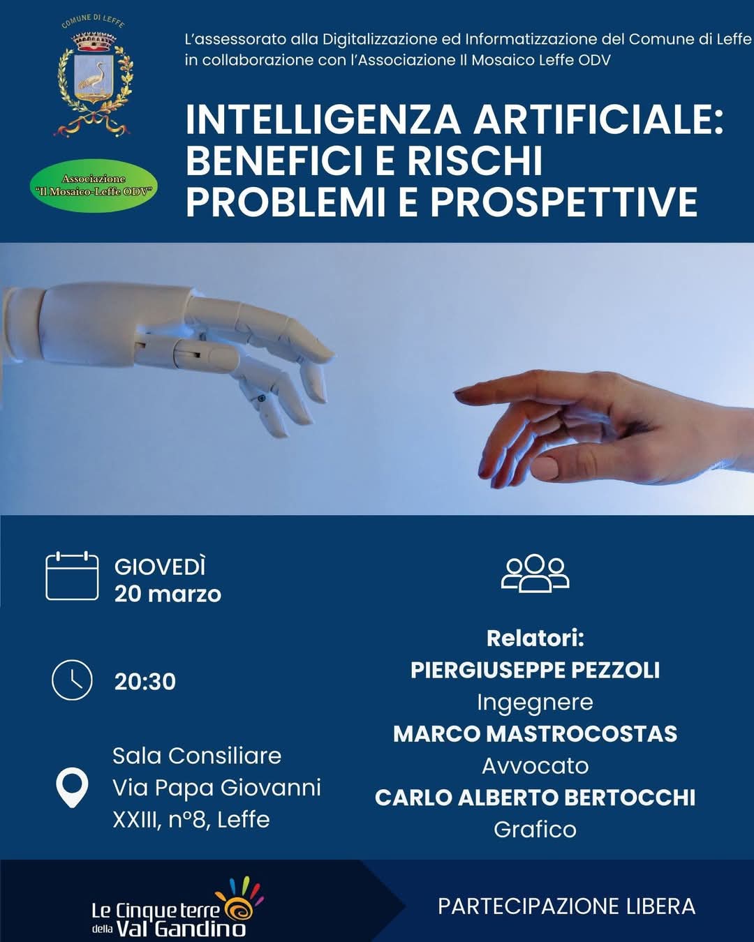 L'assessorato alla digitalizzazione ed informatizzazione del Comune di Leffe e l'Associazione "Il Mosaico Leffe ODV" organizzano un incontro per sensibilizzare la popolazione sul tema dell'intelligenza artificiale.