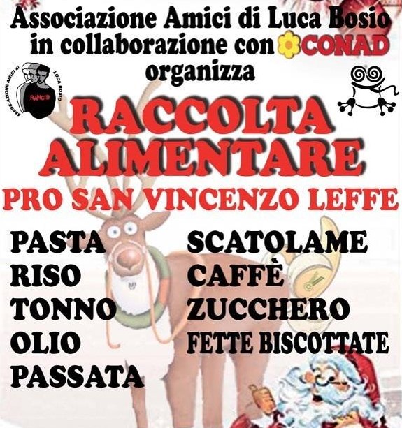L’associazione Amici di Luca Bosio (organizzatori del Bös Festival) vi aspettano tutta la giornata di sabato 16 dicembre presso il supermercato Conad per invitarvi a donare una piccola parte della propria spesa al fine di aiutare le persone del paese che sono in difficoltà.