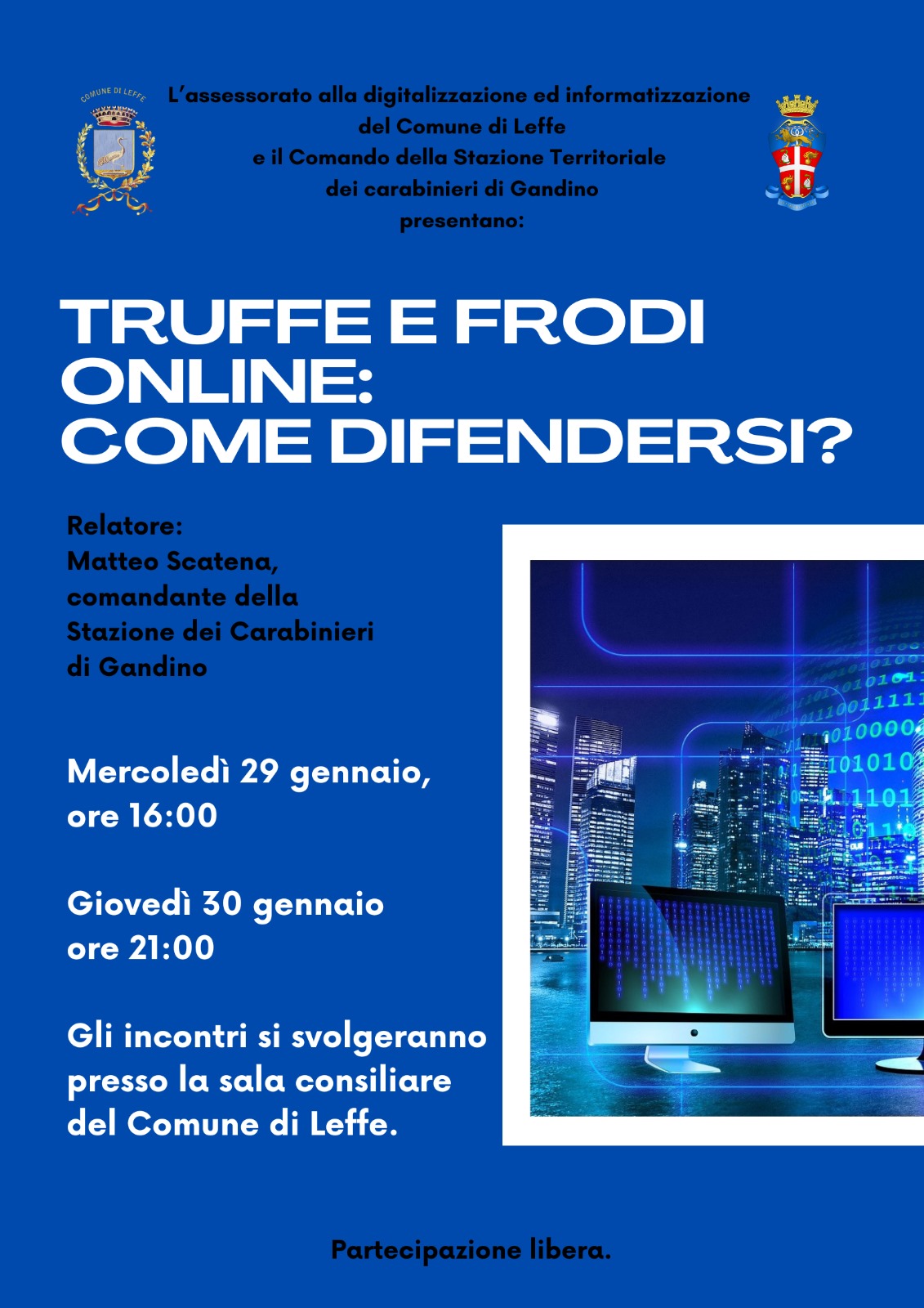 Incontro organizzato dal Comune di Leffe con i carabinieri della stazione di Gandino per sensibilizzare la popolazione sulle truffe e frodi online. Appuntamento anche giovedì 30 gennaio alle 21.