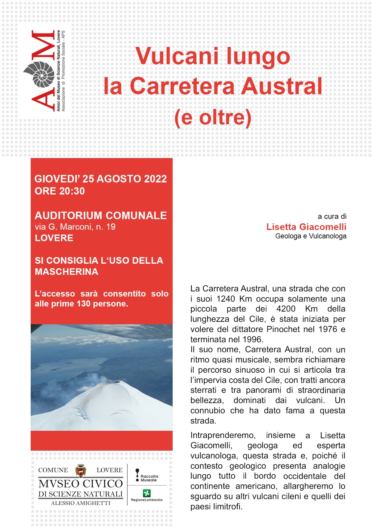 Giovedì 25 agosto 2022, alle ore 20:30 presso l’Auditorium comunale di Villa Milesi a Lovere, si terrà la conferenza a cura di Lisetta Giacomelli, geologa e vulcanologa, dal titolo "Vulcani lungo la Carretera Austral del Cile e oltre".