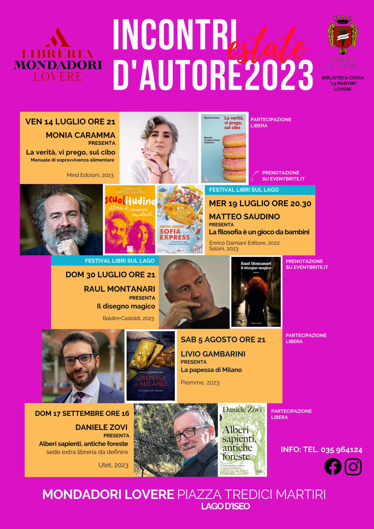 Domenica 17 settembre 2023, nellโambito della rassegna โIncontri dโAutoreโ organizzata dalla Libreria Mondadori di Lovere, Daniele Zovi presenterร il suo libro โAlberi sapienti, antiche foresteโ. Lโiniziativa, con partecipazione libera, si terrร alle ore 16 in una sede da definire.