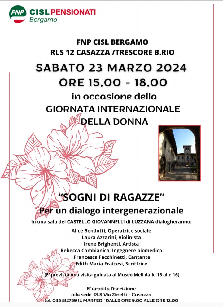 In occasione della Giornata internazionale della Donna la Segreteria della FNP CISL di Bergamo organizza in collaborazione con l'Associazione Amici del Museo Meli di Luzzana Asp una serata durante la quale sei ragazze di oggi, competenti nel loro lavoro (una scrittrice, una musicista, una cantante, un'operatrice sociale, un ingegnere biomedico, un'artista) presenteranno i loro sogni, le loro aspettative, le opportunità entro le quali si muovono per vivere la condizione femminile in questo nostro periodo storico.