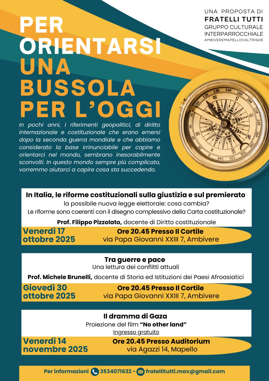 Il gruppo culturale interparrocchiale Fratelli Tutti presenta «Per orientarsi. Una bussola per l'oggi», una serie di incontri per approfondire il complesso scenario geopolitico e sociale attuale. Proiezione del film «No other land».