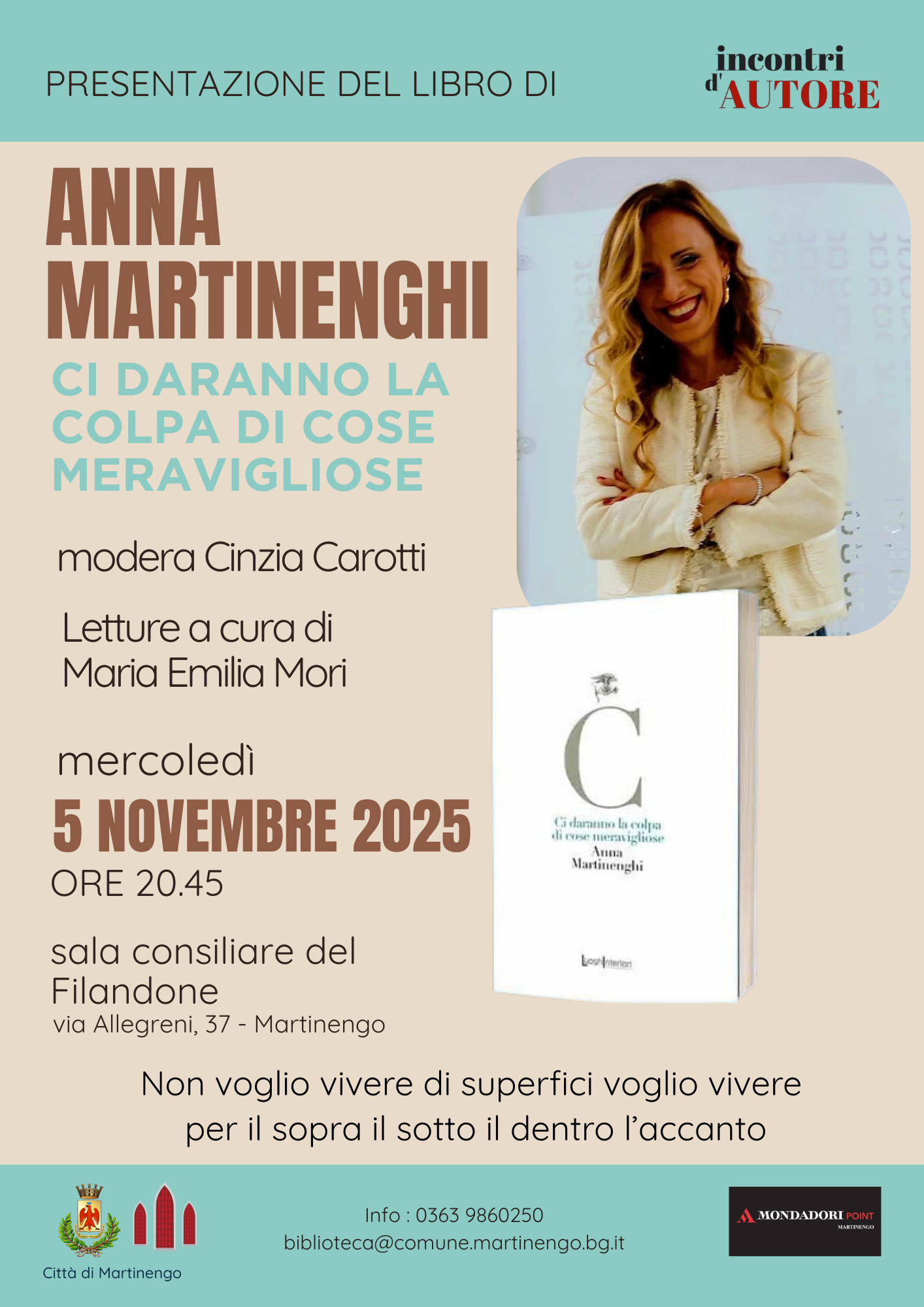 Anna Martinenghi, vincitrice di numerosi e prestigiosi premi letterari, è un'autrice affermata. La sua raccolta «Ci daranno la colpa di cose meravigliose» si è recentemente classificata seconda (ex aequo) al Premio Letterario Città di Castello. In passato ha anche vinto il Premio Bukowski per la Sezione poesia con la raccolta "O2. Ossigeno" e il Premio Letterario Nazionale Giovane Holden nella sezione Poesia inedita.