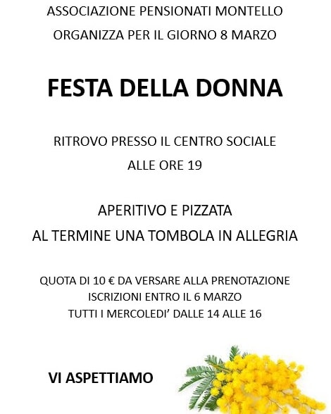 L’Associazione pensionati del Comune di Montello organizza, in occasione della Festa della Donna, un aperitivo e pizzata presso il Centro Sociale.
