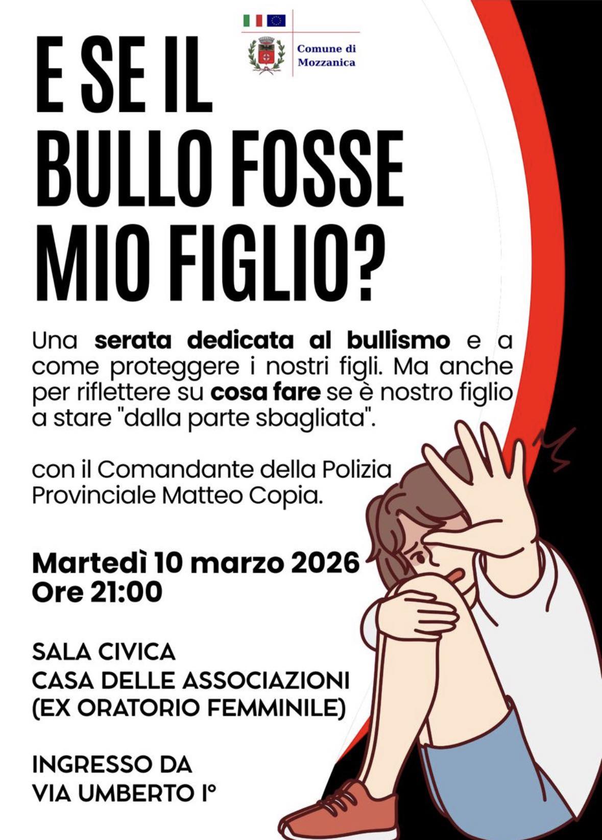 L'incontro ยซE se il bullo fosse mio figlio?ยป รจ una serata dedicata ad approfondire il fenomeno del bullismo, con l'obiettivo di capire come proteggere i propri figli e come intervenire qualora siano loro stessi a mettere in atto comportamenti scorretti. L'evento vedrร la partecipazione del Comandante della Polizia Provinciale, Matteo Copia, che guiderร la riflessione sul tema.