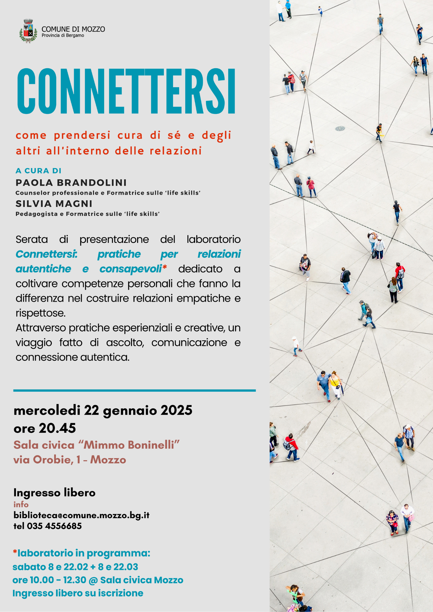 Il laboratorio verrà presentato mercoledì 22 gennaio, alle ore 20.45, presso la Sala Civica “Mimmo Boninelli” (via Orobie, 1 Mozzo), con un evento in cui sarà possibile sperimentare alcune delle pratiche che saranno proposte nel percorso. La partecipazione è a ingresso libero.