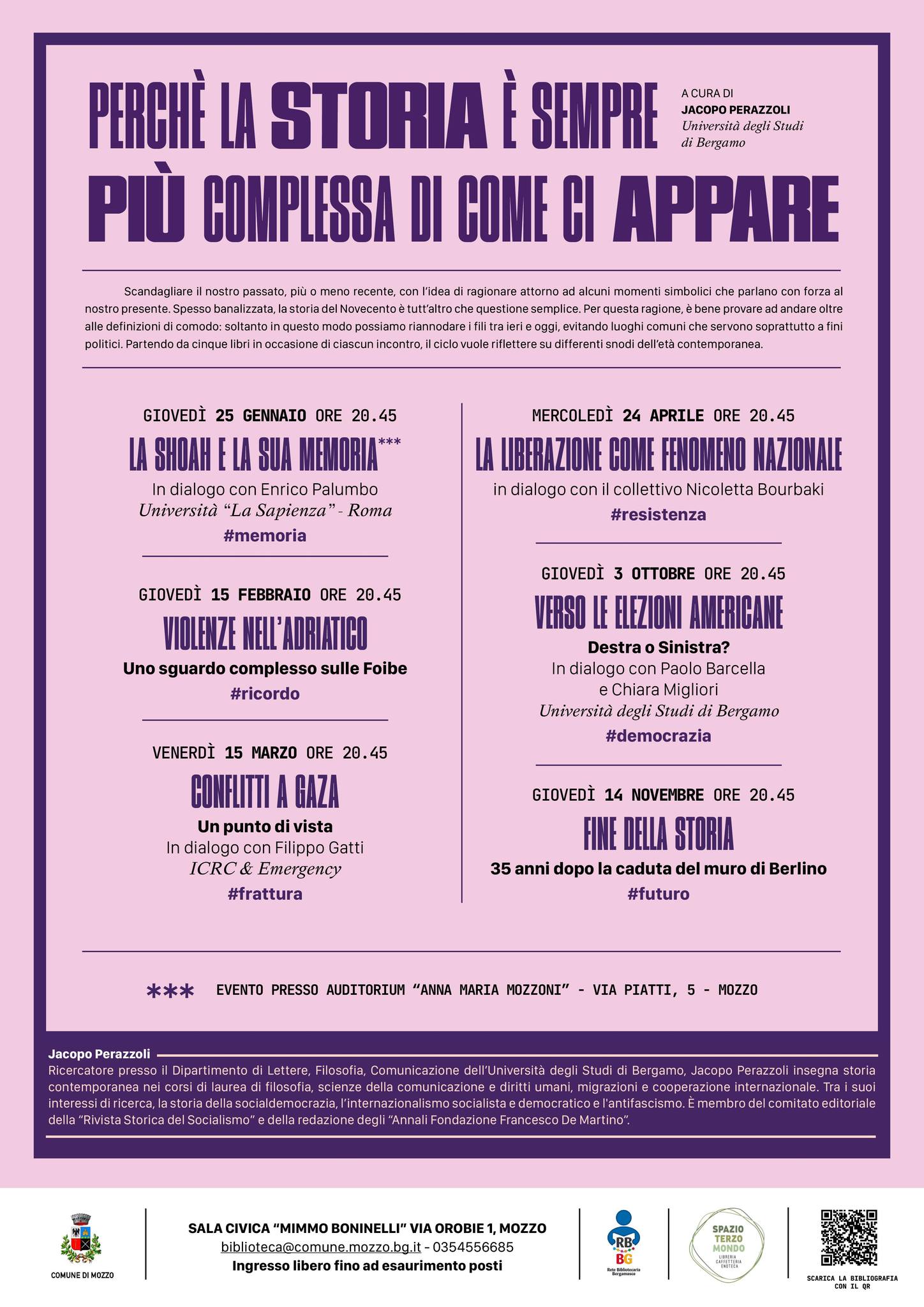 "Perché la storia è sempre più complessa di come ci appare” è un festival di Storia e Attualità per cercare di capire meglio il passato e il filo che lo lega al presente Shoah, Foibe, Gaza, Liberazione, Elezioni americane e Caduta del Muro di Berlino. Spesso banalizzata, la storia del Novecento è tutt’altro che una questione semplice. Partendo da cinque libri, il ciclo di incontri vuole riflettere su sei differenti snodi dell’età contemporanea. È questo l’intento del festival a cura di Jacopo Perazzoli dell’Università degli Studi di Bergamo, organizzato dalla Biblioteca Comunale “Sandro Pertini” di Mozzo, che si svolgerà da gennaio sino al mese di novembre.