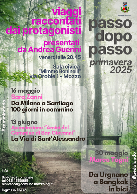 «Passo dopo Passo primavera 2025» è a cura della Biblioteca comunale “Sandro Pertini” di Mozzo e di Andrea Guerini, viaggiatore che nella prima edizione di «Passo dopo Passo» ha raccontato i suoi viaggi a piedi e in bicicletta, con lo scopo di invogliare sempre più persone alla pratica del viaggio a “velocità ridotta”. Anche in questi nuovi tre incontri saranno due i tipi di viaggi raccontati: a piedi o in bicicletta, fra autentiche imprese all’insegna della scoperta di nuove umanità, realtà sconosciute e culture altre e anche – novità di questa edizione – un viaggio dal carattere storico.
