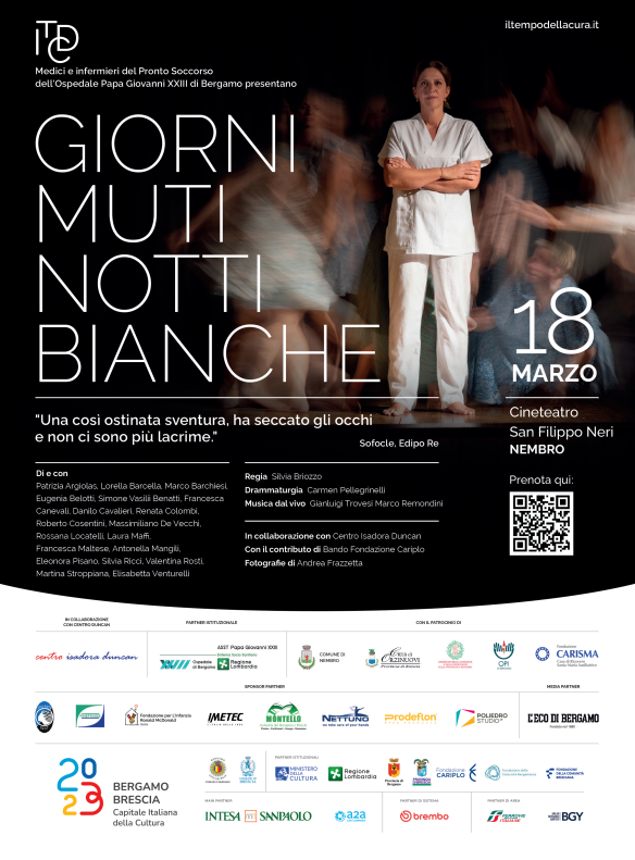 Da quel momento sospeso, fatto di dolore e speranza, fatica e solidarietà, nasce Giorni muti notti bianche, uno spettacolo ideato e interpretato dagli stessi infermieri e medici protagonisti di quei giorni. Un'opera che vuole restituire un’esperienza entrata a far parte della storia di ciascuno. Racconto corale, generoso ed epico, nel quale medici e infermieri si spogliano del proprio ruolo professionale per mettersi a nudo, lasciando aperte le proprie ferite in un rito laico e collettivo.