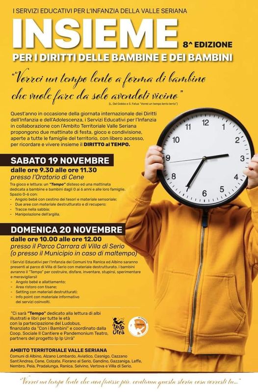 Quest'anno in occasione della giornata internazionale dei Diritti dell'Infanzia e dell'Adolescenza, i Servizi Educativi per l'infanzia in collaborazione con l'Ambito Valle Seriana ricordano e festeggiano insieme il DIRITTO AL TEMPO attraverso due mattinate di festa, gioco e condivisione, aperte a tutte le famiglie del territorio.