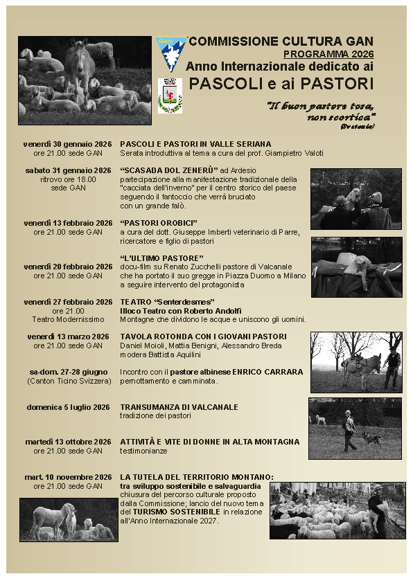 Per il ciclo di incontri dell'Anno Internazionale dedicato ai pascoli e pastori, è in programma l'incontro con dottor Giuseppe Imberti, veterinario di Parre e ricercatore, alla sede della GAN di Nembro.