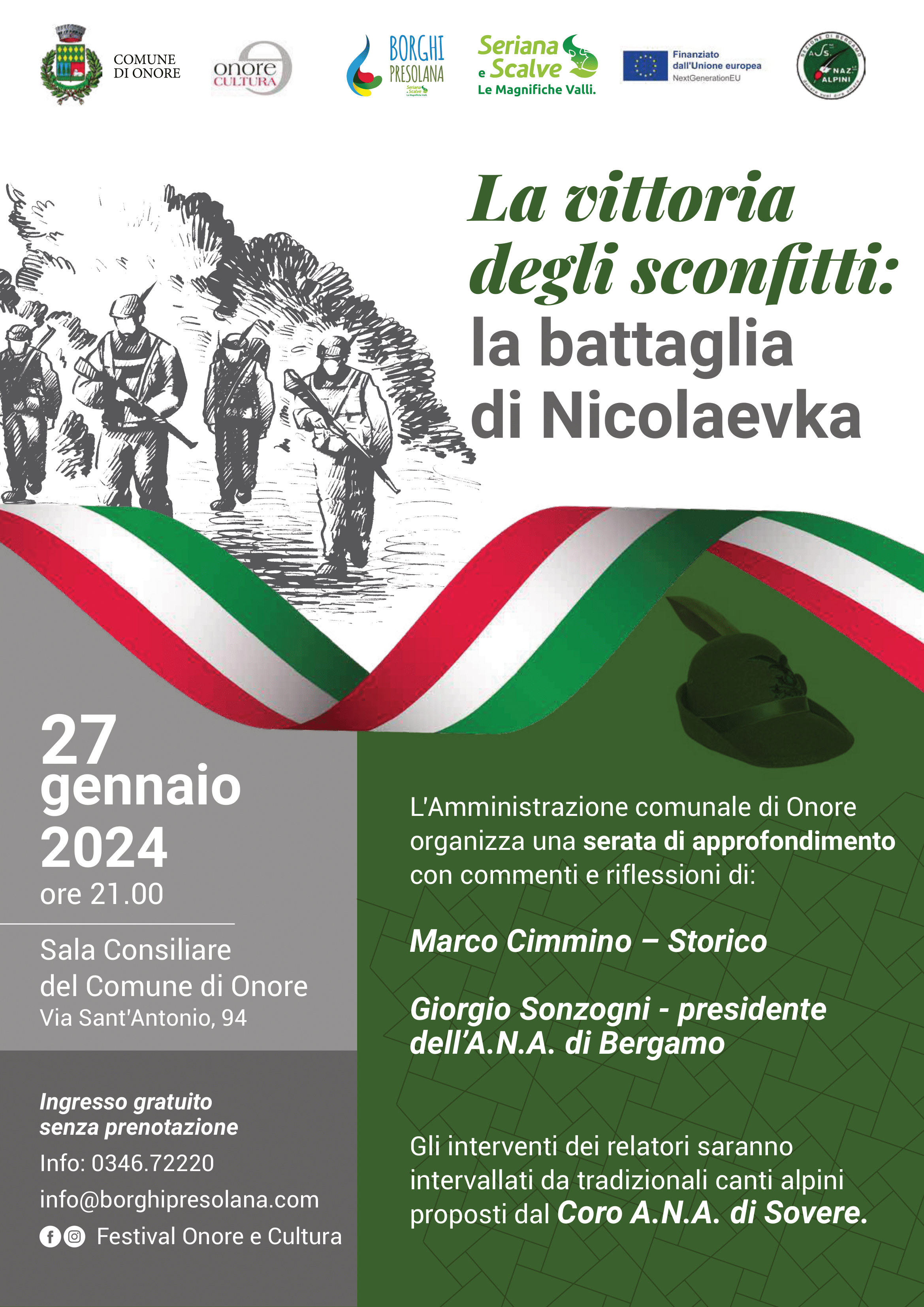 LโAmministrazione comunale di Onore organizza una serata di approfondimento sulla la battaglia di Nicolaevka presso la Sala Consiliare del Comune di Onore con commenti e riflessioni di: Marco Cimmino โ Storico Giorgio Sonzogni โ presidente dellโA.N.A. di Bergamo.