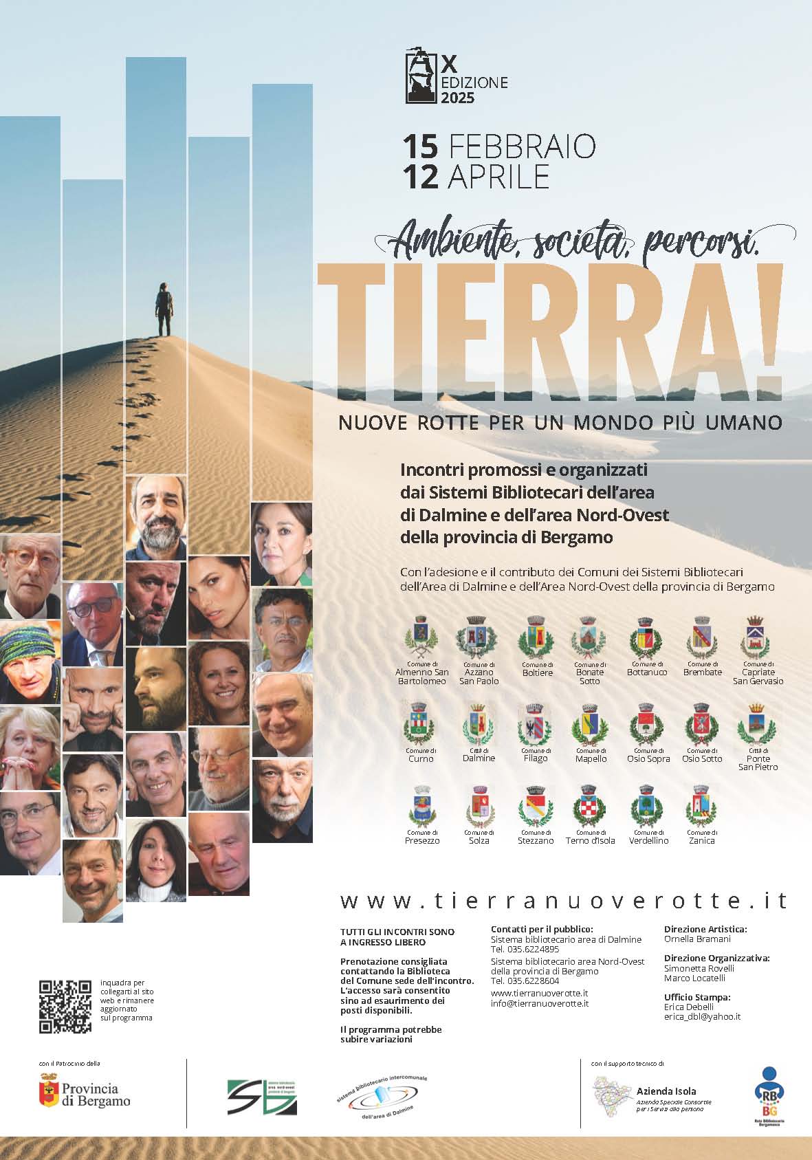 Torna la rassegna organizzata dai Sistemi Bibliotecari Intercomunali dell’Area di Dalmine e dell’area Nord-Ovest della provincia di Bergamo. Dal 15 febbraio al 12 aprile, incontri gratuiti ospitati in diversi comuni della bergamasca. Appuntamenti con scrittori, giornalisti, poeti, studiosi ed esperti in vari campi del sapere. Per approfondire temi legati all’ambiente, alla società, al mondo che ci pone di fronte a innumerevoli sfide, in continua e veloce trasformazione. Guardiamo ad un futuro migliore facendo tesoro della storia, della memoria e delle nostre tradizioni. Approfondiamo, con l’aiuto di autorevoli relatori, l’attualità che ci riguarda da vicino ma anche realtà di paesi a noi più lontani, inevitabilmente connessi. Ci mettiamo all’ascolto di storie di vita e di conoscenza, perché conoscere è aprire la mente, è fare nuove esperienze; è scoperta, arricchimento personale. È confronto che aiuta a crescere e a riflettere.