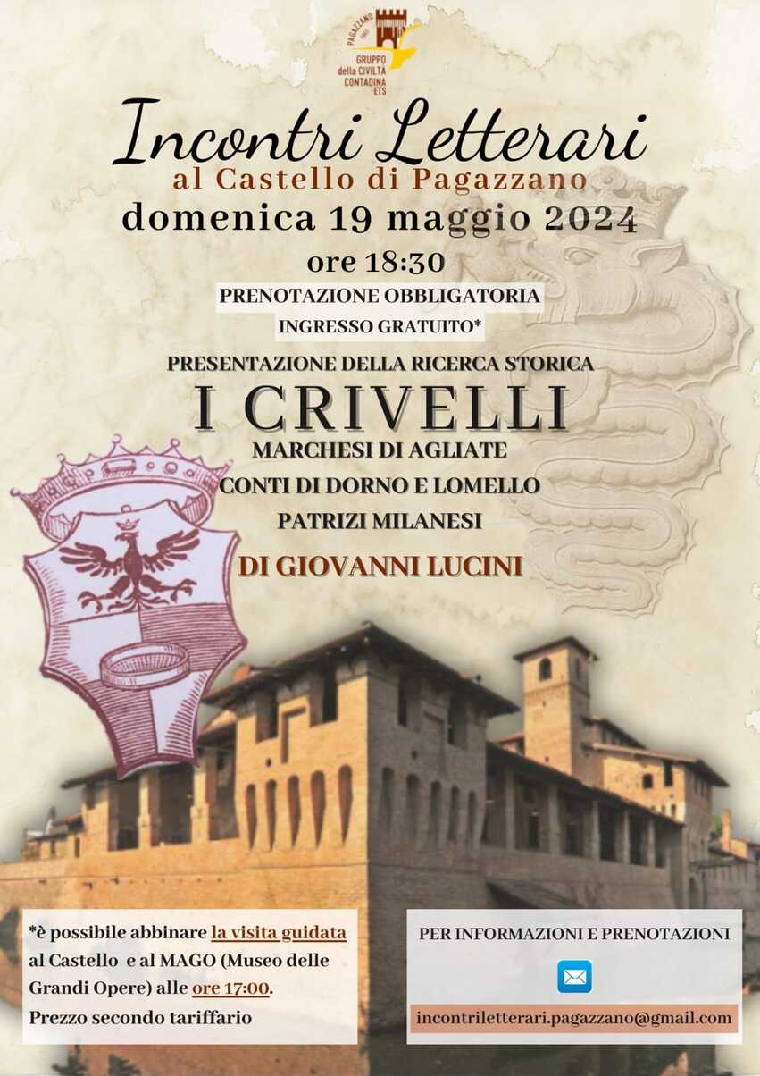 Domenica 19 maggio l’autore Giovanni Lucini presenterà il suo libro “I Crivelli marchesi di Agliate conti di Dorno e Lomello patrizi milanesi”, uno studio dedicato alla storia della famiglia nobile Crivelli, presente fra l’Ottocento e Novecento anche nel nostro maniero.