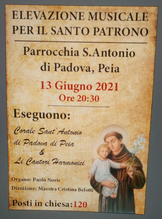 In occasione della festa patronale di S.Antonio da Padova, la parrocchia di Peia propone domenica 13 giugno alle 20.30 un’elevazione musicale nella chiesa parrocchiale.