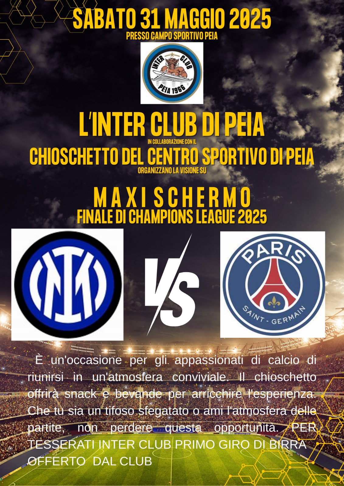 Sabato 31 maggio, presso il campo sportivo di Peia, lโInter Club di Peia, in collaborazione con il Chioschetto del Centro Sportivo, organizza la visione della finale di Champions League 2025 su maxischermo.