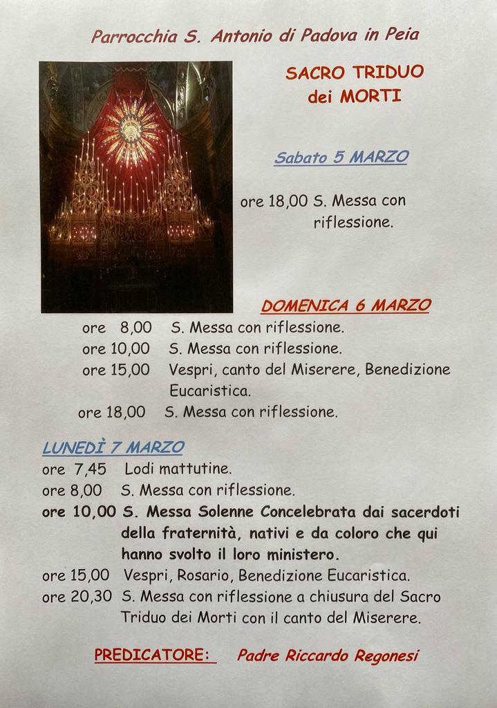 Da sabato 5 a lunedรฌ 7 marzo, presso la Parrocchia di S. Antonio di Padova a Peia, si terrร il Sacro Triduo dei Morti.