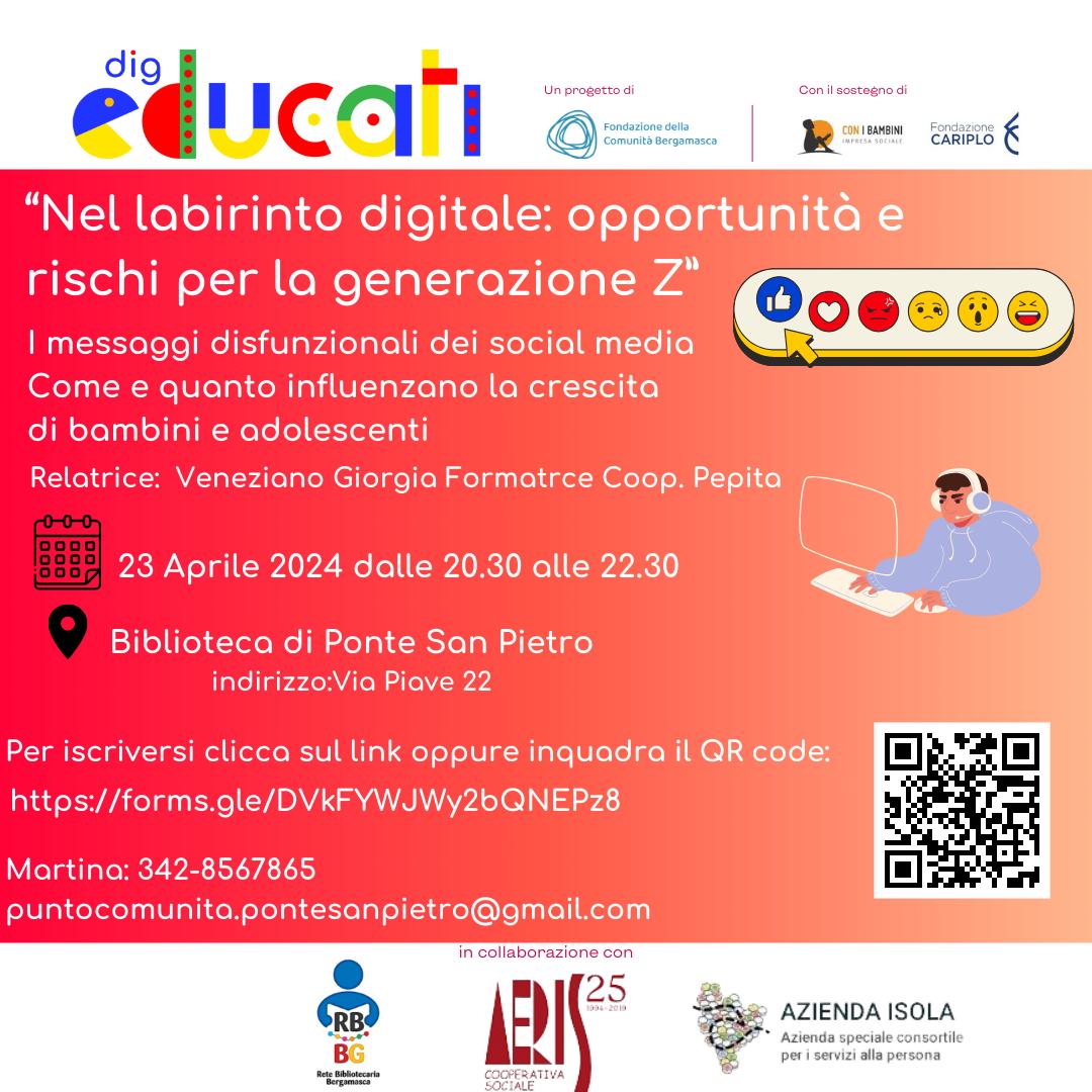 "Nel labirinto digitale: opportunità e rischi per la generazione Z" organizzata dai Punti di Comunità Digeducati dell'Ambito Isola Bergamasca e Bassa Val San Martino. I messaggi disfunzionali dei social media, come e quanto influenzano la crescita di bambini e adolescenti.