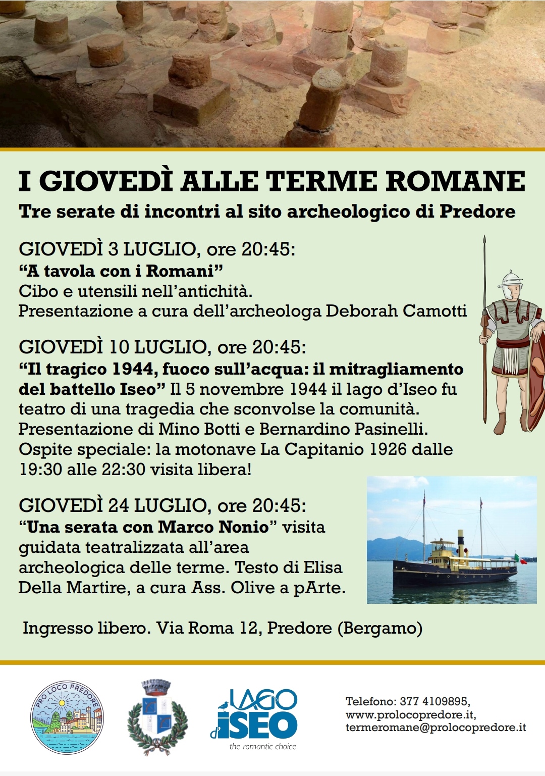 In occasione della consueta serie estiva di incontri di luglio "I Giovedรฌ alle Terme Romane", l'archeologa Deborah Camotti terrร una presentazione dal titolo "A tavola con i Romani - Cibo e utensili nell'antichitร ".