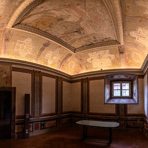 Attraverso il portico, affrescato con motivi a grottesca e lunette, si accederà poi alle sale decorate alla fine del XVI secolo dal pittore bergamasco Giovan Paolo Cavagna: si potranno così ammirare il salone dedicato a Ercole e le salette minori a Susanna, Giuditta e Apollo. Di tali opere sono visibili solo le tracce rimaste dopo lo strappo degli affreschi attuato nella prima metà del 1900, ad opera degli ultimi proprietari.