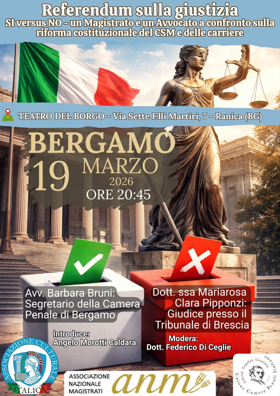 Presso il Teatro del Borgo di Ranica, è in programma un confronto sulla riforma costituzionale del Consiglio Superiore di Magistratura e delle carriere, in collaborazione con l'Associazione Nazionale Magistrati e l'Unione delle Camere Penali.