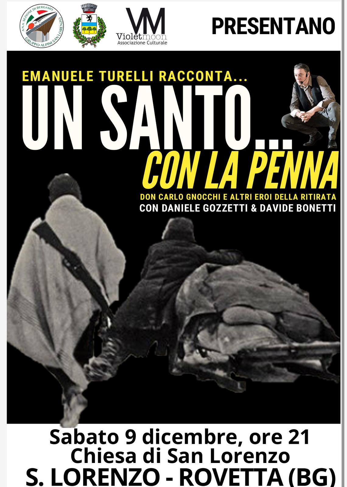 Emanuele Turelli vi invita a partecipare al racconto “Un santo con la penna” sabato 9 dicembre presso la Chiesa Parrocchiale di San Lorenzo di Rovetta. Daniele Gozzelli e Davide Bonetti riporteranno la storia di Don Carlo Gnocchi e di altri eroi della ritirata.