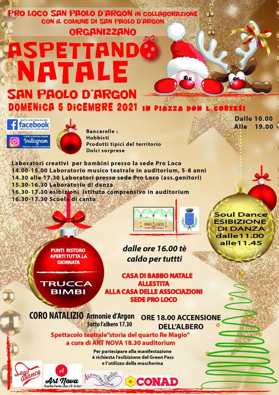 Dalle ore 10:00 di domenica 5 Dicembre saranno disposte delle bancarelle con hobbistica, dolci e prodotti tipici, alle ore 11:00 si terrà un esibizione di danza, dalle ore 14:00 verranno realizzati laboratori creativi per bambini presso la sede della proloco (musica, teatro, danza e canto), alle 16:00 ci sarà il the caldo per tutti, truccabimbi, punti ristoro lungo tutta la giornata e verrà allestita la casa di Babbo Natale. Alle ore 17:30 si esibirà il coro natalizio, alle 18:00 l'accensione dell'albero ed alle 18:30 lo spettacolo teatrale "Storia del quarto Re Magio".
