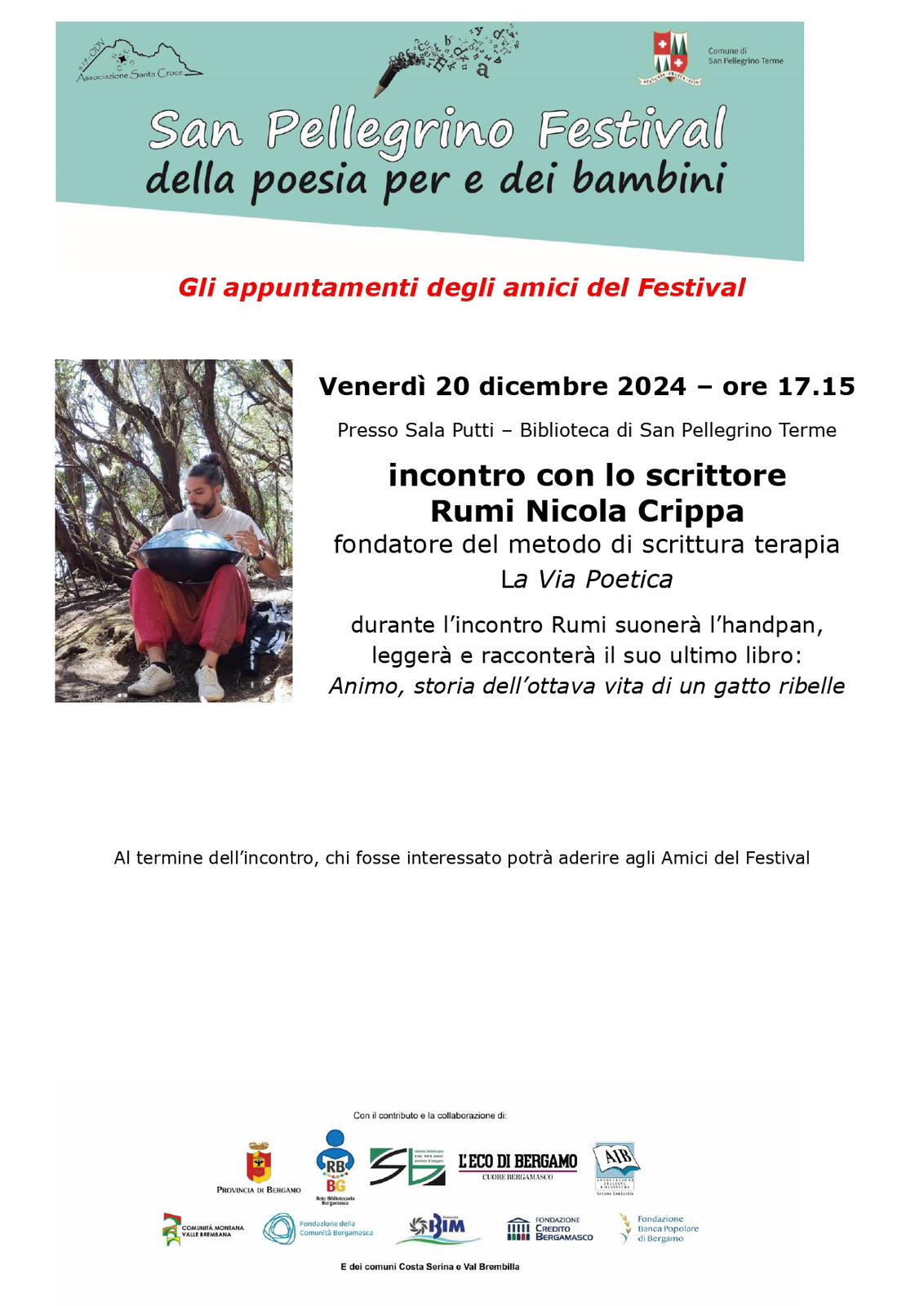 Il "San Pellegrino Festival della poesia per e dei bambini" ospiterà lo scrittore Rumi Nicola Crippa, fondatore del metodo di scrittura-terapia "La Via Poetica". La scrittura creativa può educare a guardare diversamente al mondo, dai più grandi ai piccini.