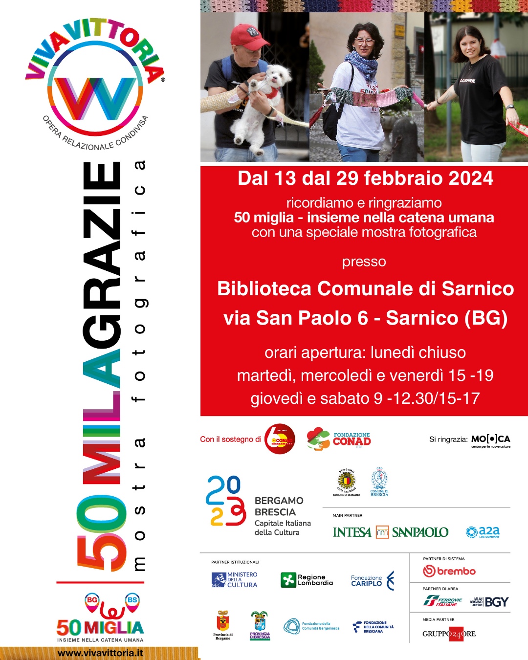 Da martedì 13 a giovedì 29 febbraio, presso la Biblioteca Comunale di Sarnico, si terrà la mostra fotografica "50 mila grazie", per ricordare e ringraziare tutti coloro che hanno reso possibile l'evento “Bergamo e Brescia - 50 miglia insieme nella catena umana”.