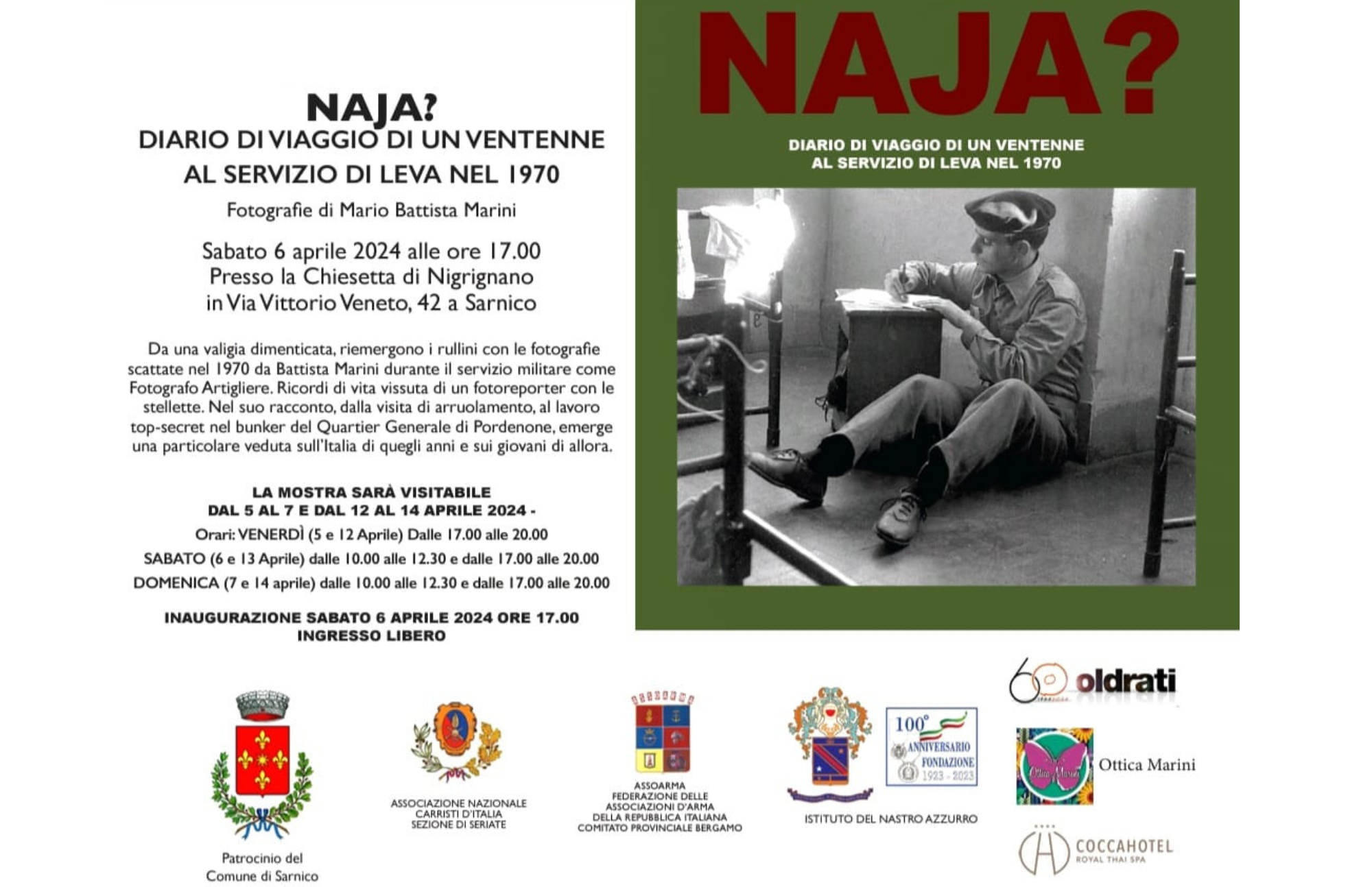 Per due weekend, da venerdì 5 a domenica 7 aprile e da venerdì 12 a domenica 14 aprile, presso l'Ex Chiesetta di Nigrignano di Sarnico, si terrà la mostra fotografica "Naja? - Diario di viaggio di un ventenne al servizio di leva nel 1970" a cura del fotografo Mario Battista Marini. Da una valigia dimenticata, riemergono i rullini con le fotografie scattate nel 1970 da Battista Marini durante il servizio militare come Fotografo Artigliere.