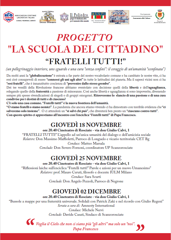 Il filo conduttore delle tre serate di questo autunno sarà l’enciclica FRATELLI TUTTI di Papa Francesco.