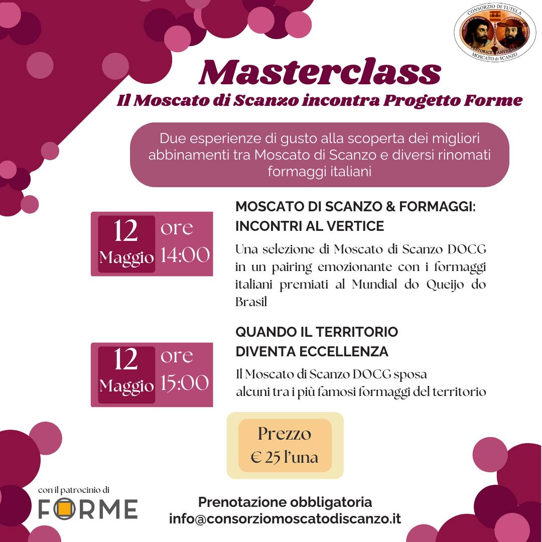 Ore 14:00 - Moscato & Formaggi: incontri al vertice: una selezione di Moscato di Scanzo DOCG in un pairing emozionante con i formaggi italiani premiati al Mundial do Queijo do Brasil
