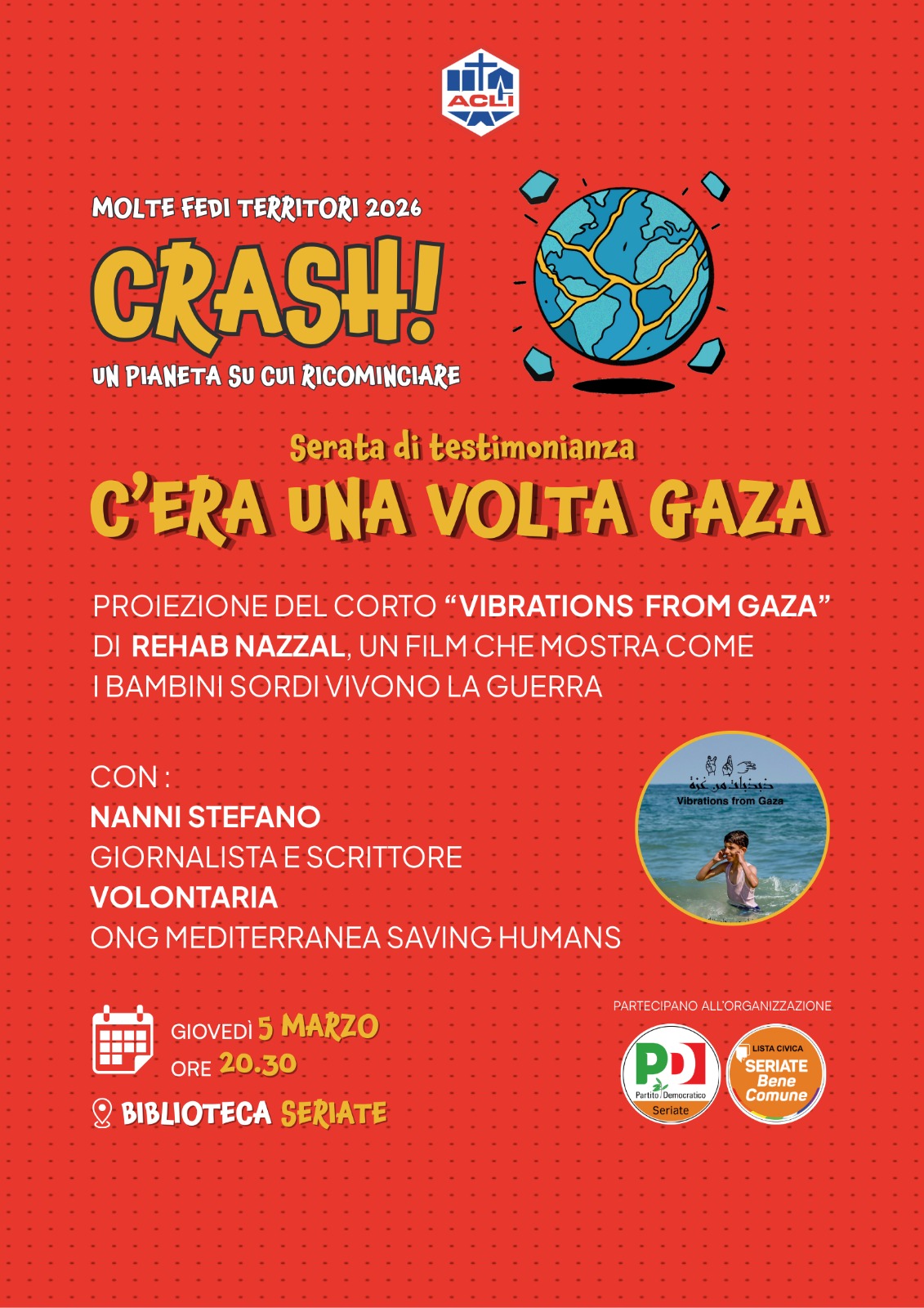 Per il ciclo di incontri di «Crash! Un pianeta su cui ricominciare» di ACLI Bergamo, è in programma una serata di testimonianza sulla storia di Gaza, con la proiezione del corto "Vibrations from Gaza" di Rehab Nazzal.