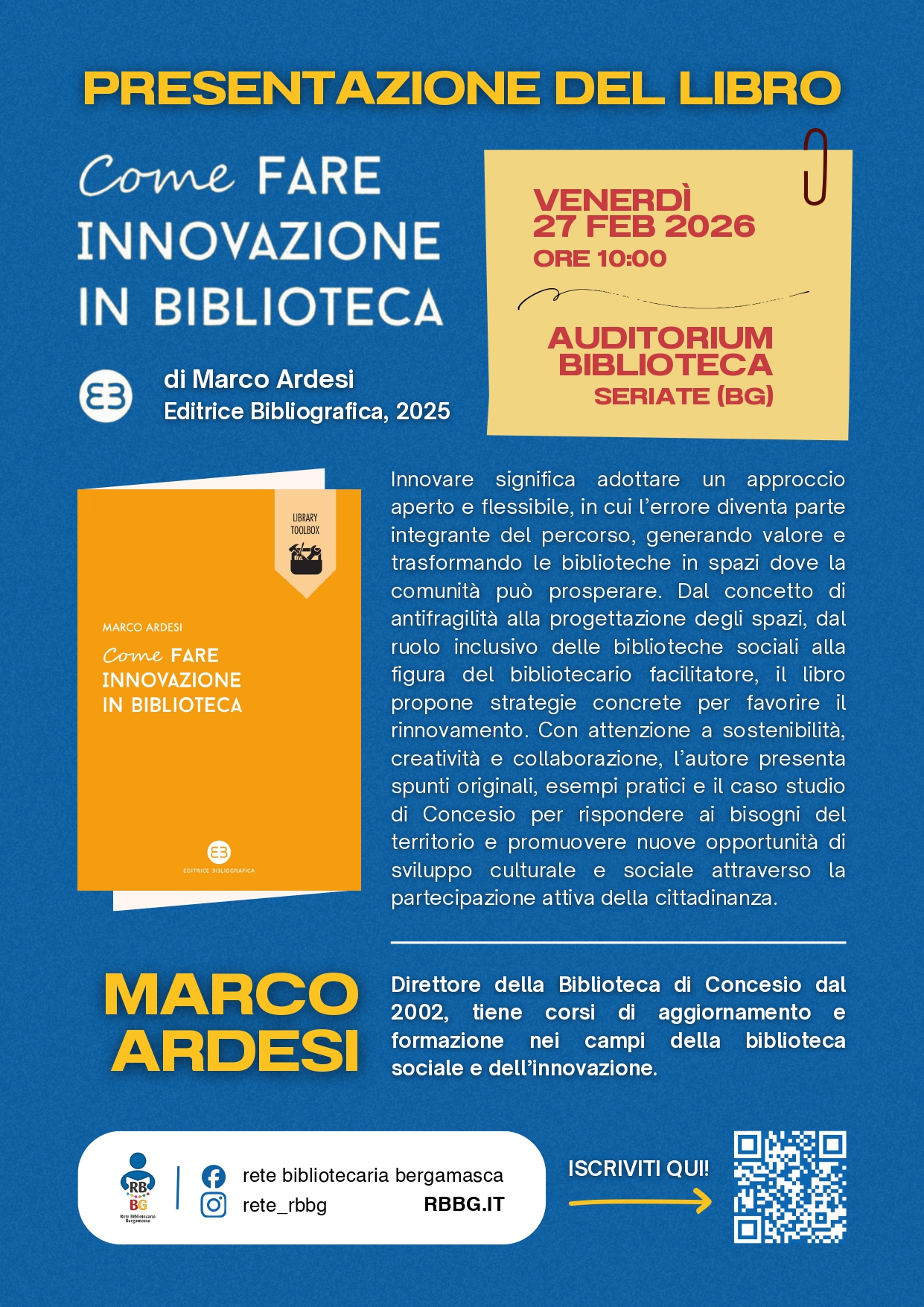 Presentazione del libro «Come fare innovazione in biblioteca», di Marco Ardesi, pubblicato da Editrice Bibliografica. Il libro sarà un'occasione per conoscere strategie concrete per favorire il rinnovamento, con attenzione a sostenibilità e creatività.