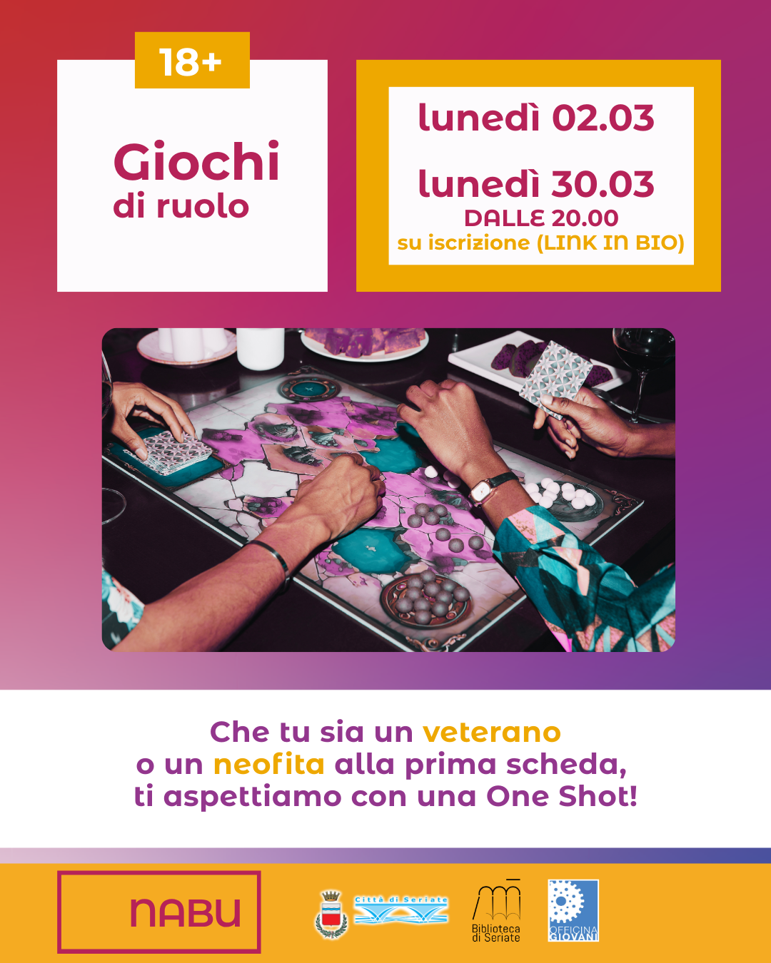 Un appuntamento dedicato ai giochi di ruolo, aperto sia ai veterani sia ai neofiti: durante la serata si giocherร una One Shot, una partita autoconclusiva che consente di partecipare anche a chi รจ alla prima esperienza.