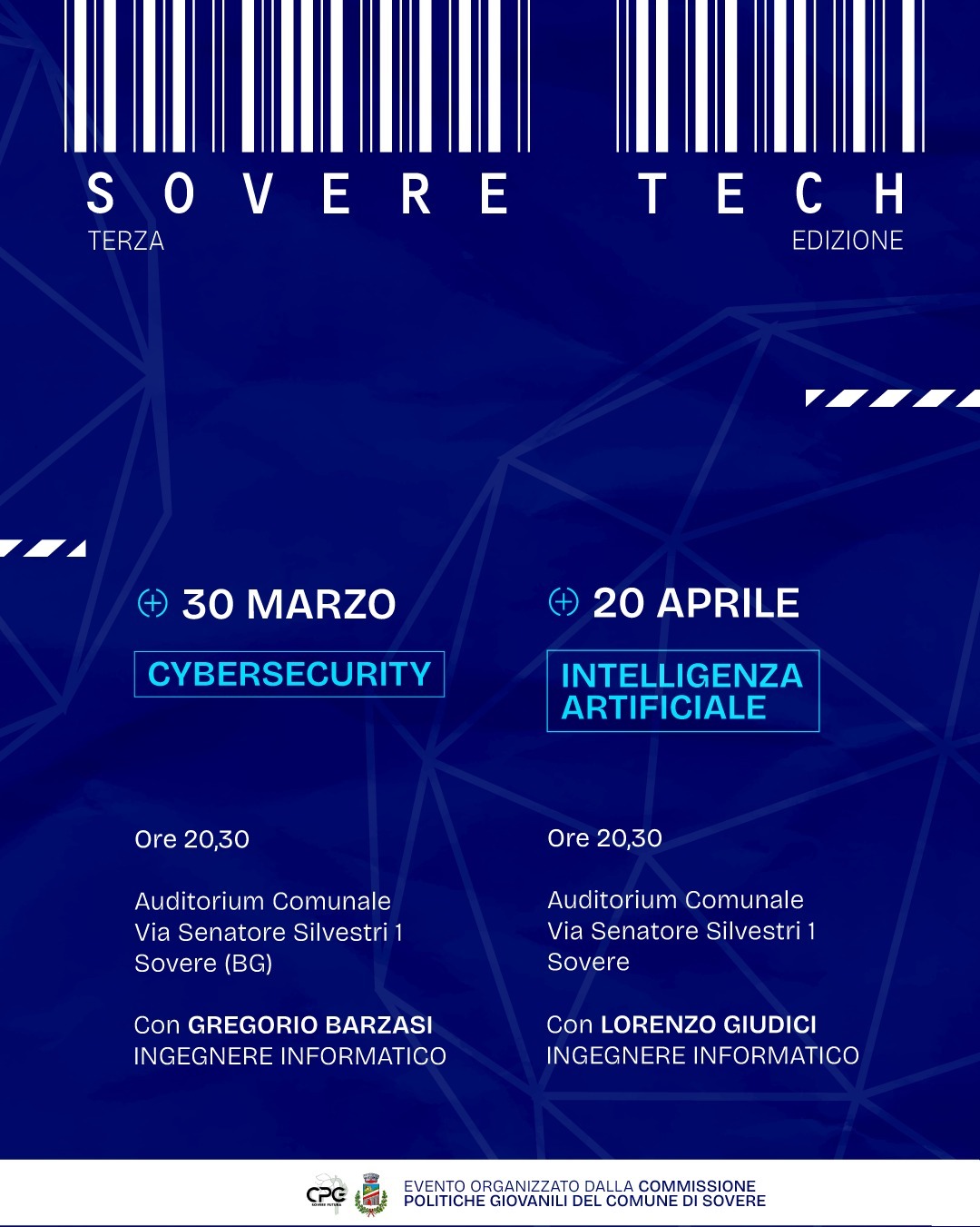 La Commissione Politiche Giovanili del Comune di Sovere organizza la rassegna ยซSovere Tech - Terza edizioneยป, che ospiterร due incontri, ad ingresso libero, dedicati alla sicurezza informatica presso l'Auditorium Comunale in via Senatore Silvestri.