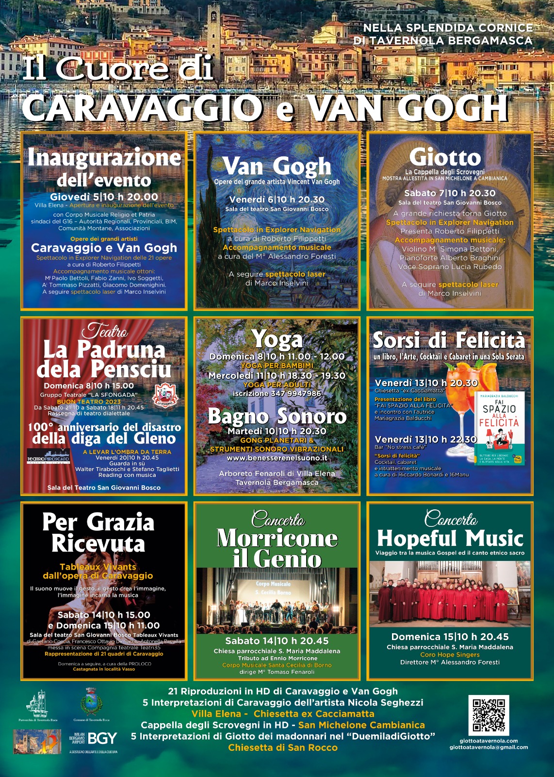 Nell'ambito dell'evento "Nel cuore di Caravaggio e Van Gogh" che si terrà dal 5 al 16 ottobre a Tavernola Bergamasca, martedì 10 ottobre alle ore 20.30, avrà luogo un Bagno Sonoro con Gong Planetari e strumenti sonoro vibrazionali presso l'Arboreto Fenaroli di Villa Elena a Tavernola Bergamasca.