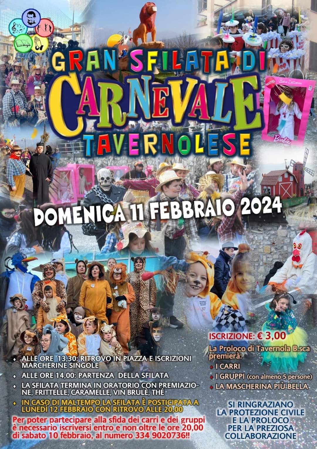 A Tavernola Bergamasca si terrà la Gran Sfilata di Carnevale Tavernolese. Programma della giornata: alle 13.30 ritrovo in piazza e iscrizioni mascherine singole; alle 14 partenza della sfilata. A fine sfilata, presso l'Oratorio, si potranno gustare frittelle, caramelle, vin brulé e tè caldo. La Pro Loco di Tavernola Bergamasca premierà i carri, i gruppi (con almeno 5 persone) e la mascherina più bella.