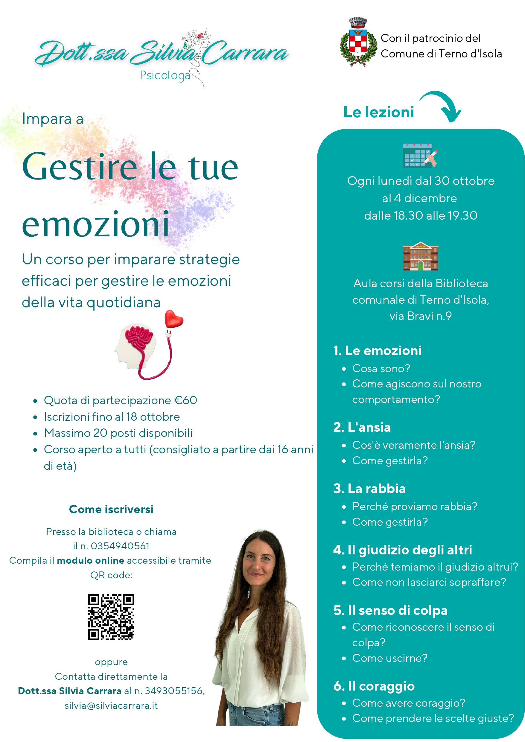 "Gestire le tue emozioni" è un corso per imparare strategie efficaci volte a gestire la vita quotidiana, tra rabbio, ansia, giudizi, senso di colpa e coraggio; a cura della dottoressa Silvia Carrara.