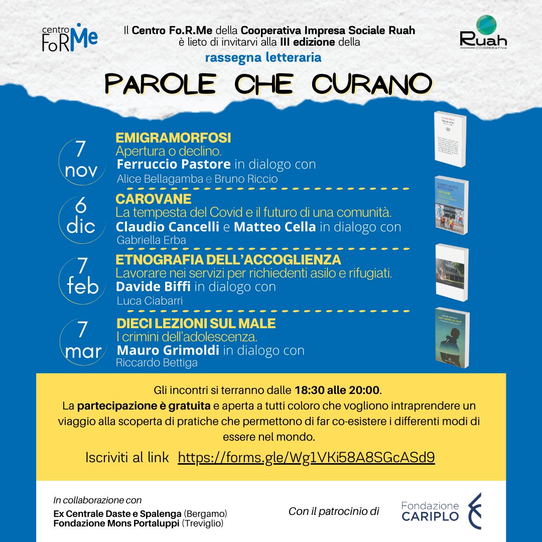 La rassegna è organizzata dal Centro Fo.R.Me. della cooperativa Ruah con la collaborazione della Fondazione Mons. Portaluppi e il patrocinio di Fondazione Cariplo.