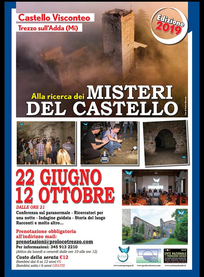-ore 21 con accoglienza. Seguirà una conferenza dove la squadra degli EPAS (European Paranormal Acticity Society) , ci presenterà quanto ha raccolto negli ultimi anni di ricerca in diversi luoghi infestanti, tra cui anche Trezzo. Proiezione immagini e video delle precedenti ricerche.