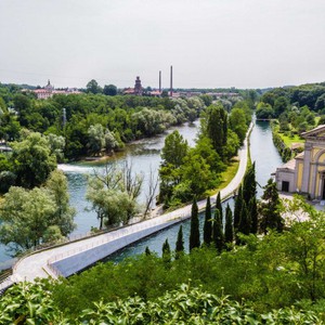 -Inquadramento dal bel Vedere del santuario sul Villaggio di Crespi d'Adda e Villa Gina