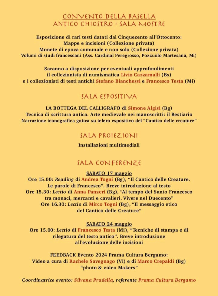 All'interno del progetto culturale «San Francesco: arte, storia e spiritualità a 800 anni dal cantico delle creature», una lectio di Anna Panzeri (Bg) dal titolo «Al tempo del Santo Francesco tra monaci, mercanti e cavalieri. Vivere nel Duecento». All'interno del lecito, Anna Panzeri presenterà il periodo duecentesco di San Francesco.