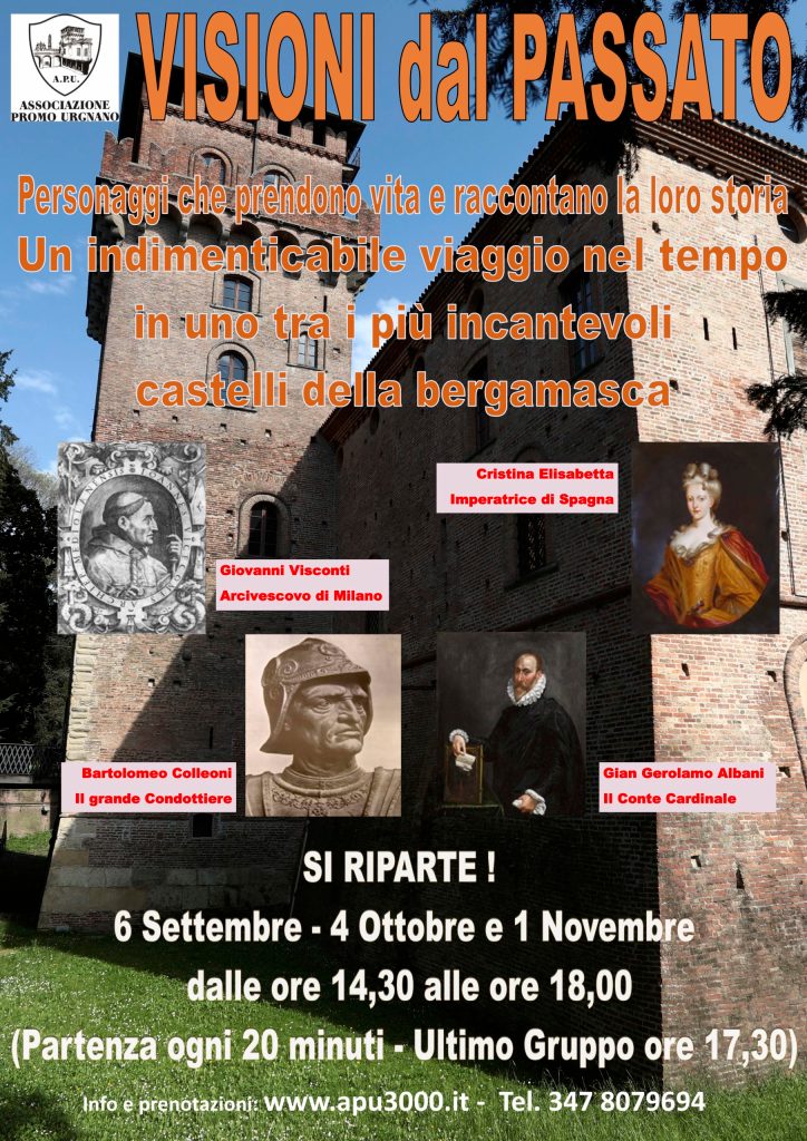 L’Associazione Promo Urgnano presenta per l’edizione di Castelli Aperti 2020 il percorso guidato all’interno della suggestiva Rocca Albani di Urgnano "Visioni dal passato": una visita guidata in una suggestiva atmosfera, che sala dopo sala, verrà valorizzata con visioni di personaggi dipinti su quadri e che prenderanno vita al passaggio dei visitatori raccontando le loro gesta.