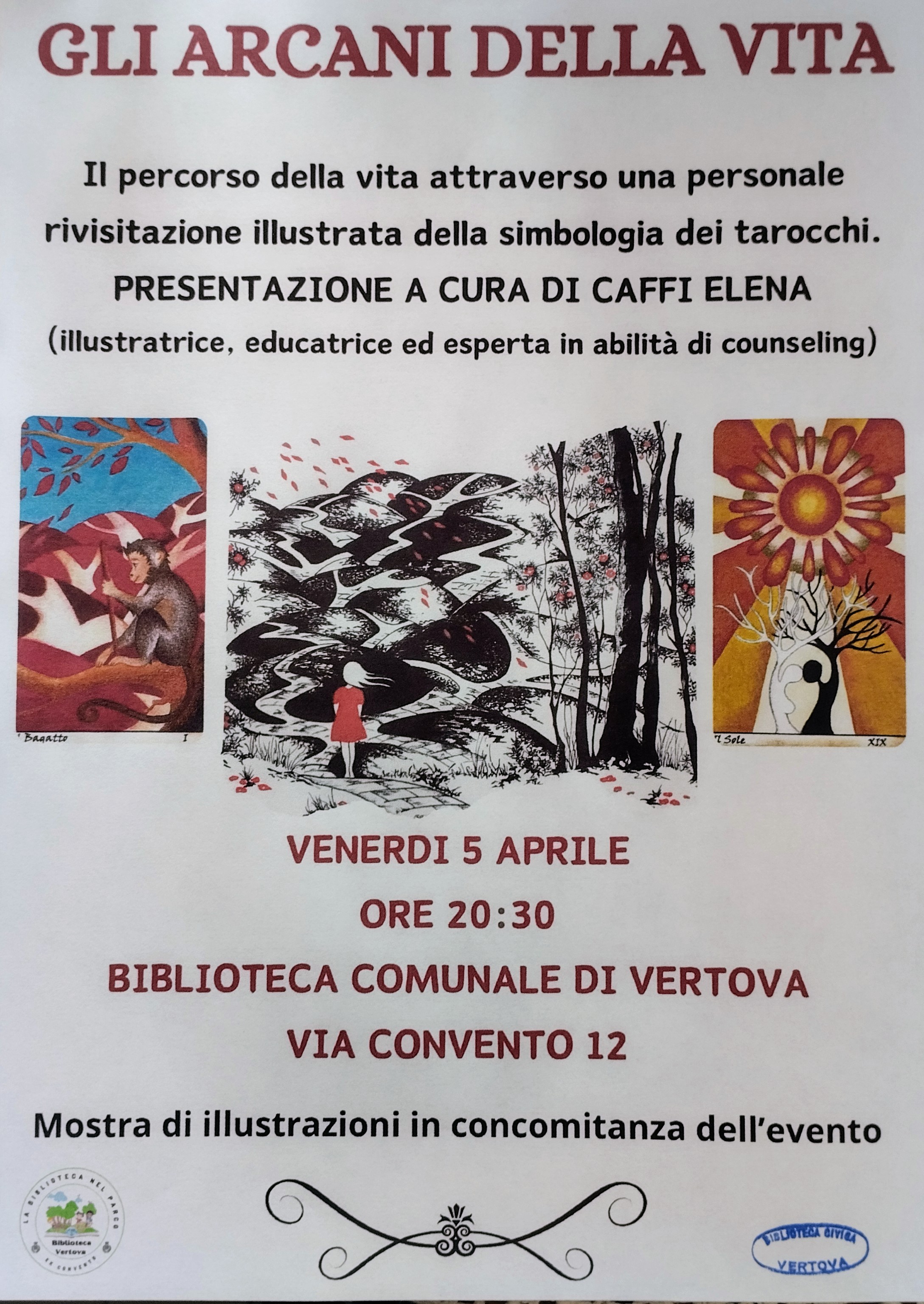 Venerdì 5 aprile, presso la biblioteca di Vertova, Caffi Elena, esperta in abilità di counseling, educatrice ed illustratrice, accompagnerà il pubblico attraverso una personale rivisitazione artistica dei 22 Arcani Maggiori dei tarocchi. L'esplorazione delle sue illustrazioni, darà modo di avvicinare questo affascinante strumento simbolico di conoscenza del sé e delle dimensioni del proprio vivere come individui e come società. Verrà valorizzata la potenza di questo linguaggio profondo e suggestivo che, come tutti i linguaggi simbolici e narrativi (i miti antichi, le fiabe...), ci rispecchia e consente di meglio conoscersi come persone in relazione con sé stessi, come individui in relazione con gli altri e come società.